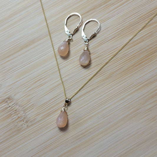 Jewelry Set Peach Moonstone Crystal Gemstone Earrings and Necklace set gold June Birthstone