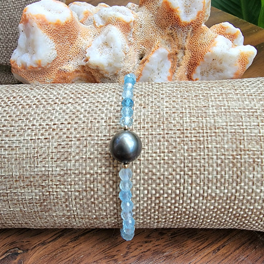 Tahitian Pearl Bracelet Aquamarine Crystal Gemstone June Birthstone Handmade, Unique gift, March Birthstone, Black South Sea pearl