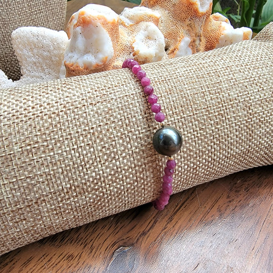 TAHITIAN PEARL BRACELET RUBY GEMSTONE CRYSTAL HANDMADE Unique Gift,July Birthstone, June Birthstone , Black south Sea pearl