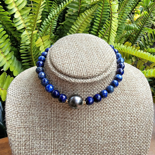 Tahitian Pearl Bracelet Lapis Lazuli Crystal Gemstone Handmade June Birthstone unique Gift, Black South Sea Pearl