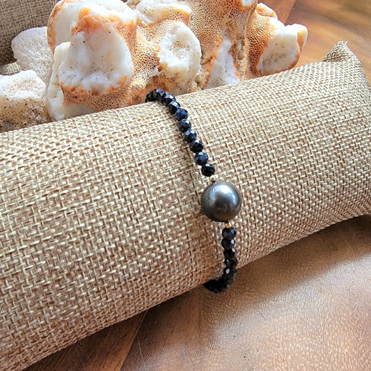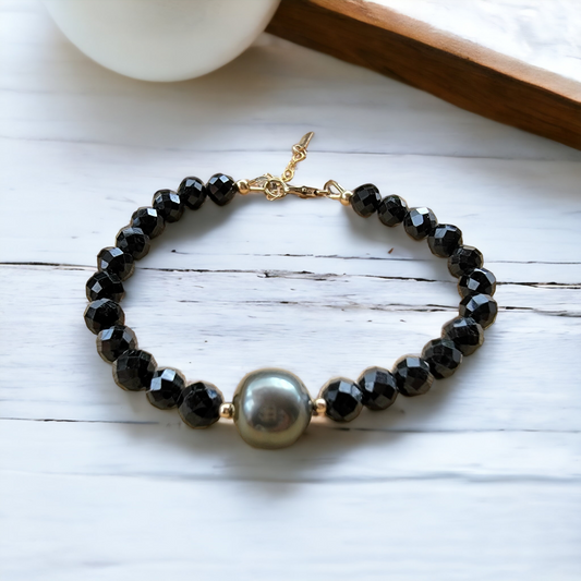 TAHITIAN PEARL BRACELET Black Spinel CRYSTAL GEMSTONE HANDMADE June Birthstone Unique Gift Black South Sea Pearl