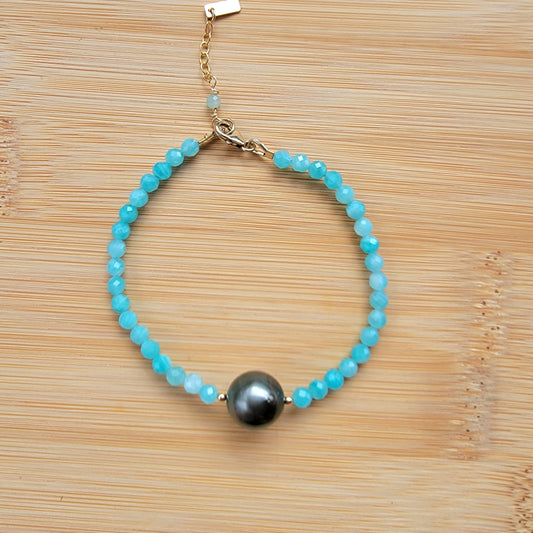 Tahitian Pearl Bracelet Amazonite Crystal Gemstone Handmade June Birthstone Unique Gift Black South Sea Pearl