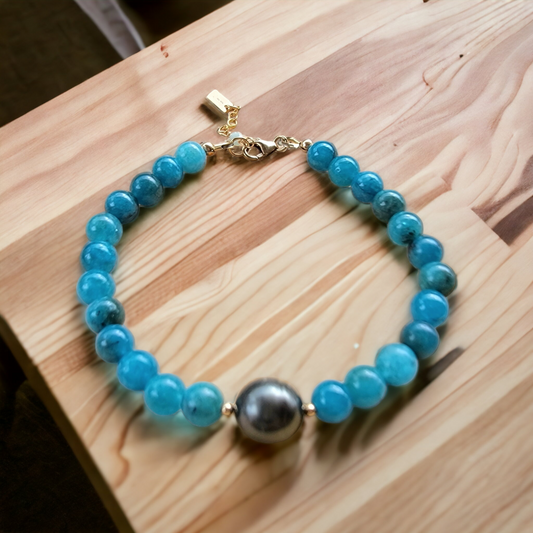 Tahitian Pearl Bracelet Apatite Crystal Gemstone June Birthstone Handmade Unique Gift Black South Sea Pearl