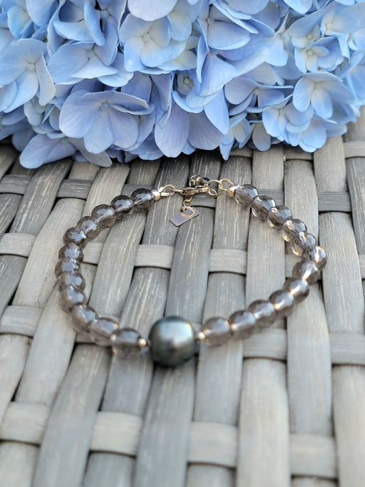 Tahitian Pearl Bracelet Smoky Quartz Crystal Gemstone Handmade June Birthstone Unique Gift Black South Sea Pearl