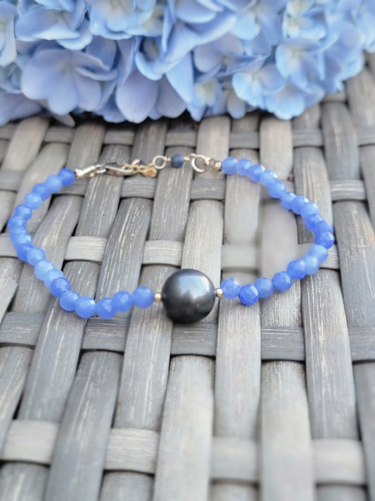 Tahitian Pearl Bracelet BLUE CHALCEDONY Crystal Gemstone Handmade June Birthstone Unique Gift Black South Sea pearl