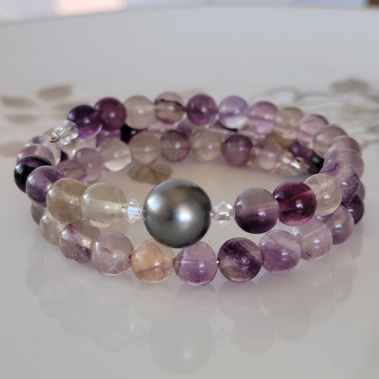 Flourite Wrap Bracelet Gemstone set in Memory Wire with Black Swarovski Pearl