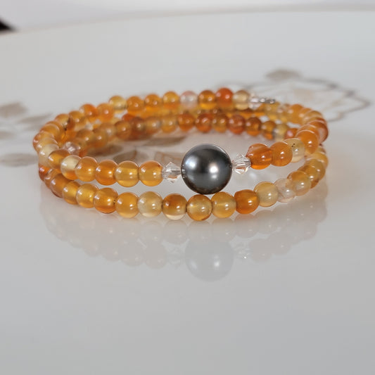Orange Carnelian Wrap Bracelet Gemstone set in Memory Wire Black swarovski Pearl