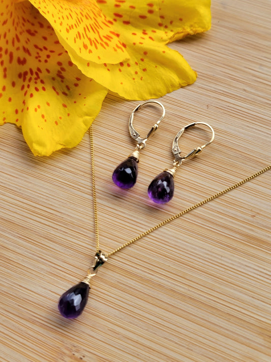 Jewelry Set Amethyst Crystal Gemstone Earrings and Necklace set 14k gold filled genuine precious February Birthstone