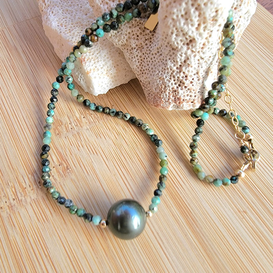 Tahitian Pearl Necklace Choker African Turquiose Crystal Gemstone June Birthstone Handmade December Birthstone